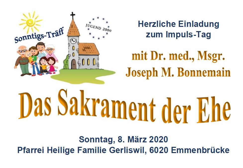 Wir freuen uns, auch im 2020 wieder einen Spezial-Anlass durchzuführen. Am Impuls-Tag im März 2020 spricht Dr. med., Msgr. Joseph M. Bonnemain. Weitere Informationen wie auch die Anmeldung findet ihr unter der Rubrik unsererAnlässe.